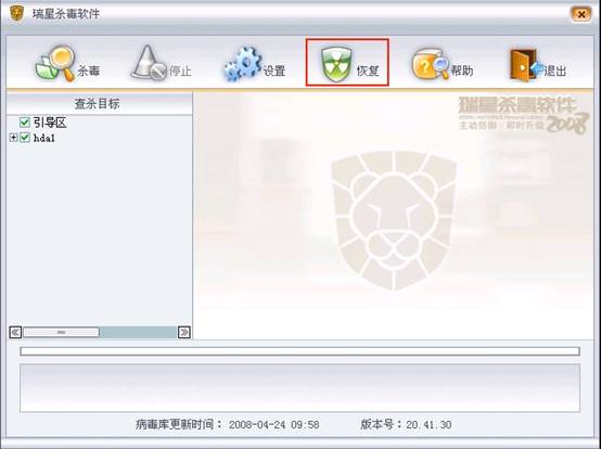 2、在杀毒界面上按【恢复】按钮,即进入硬盘数据恢复程序。