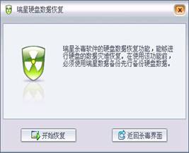 | 瑞星杀毒软件硬盘数据恢复功能,能够进行硬盘的数据灾难恢复,在使用该功能前,必须使用瑞星数据备份,先行备份硬盘数据。